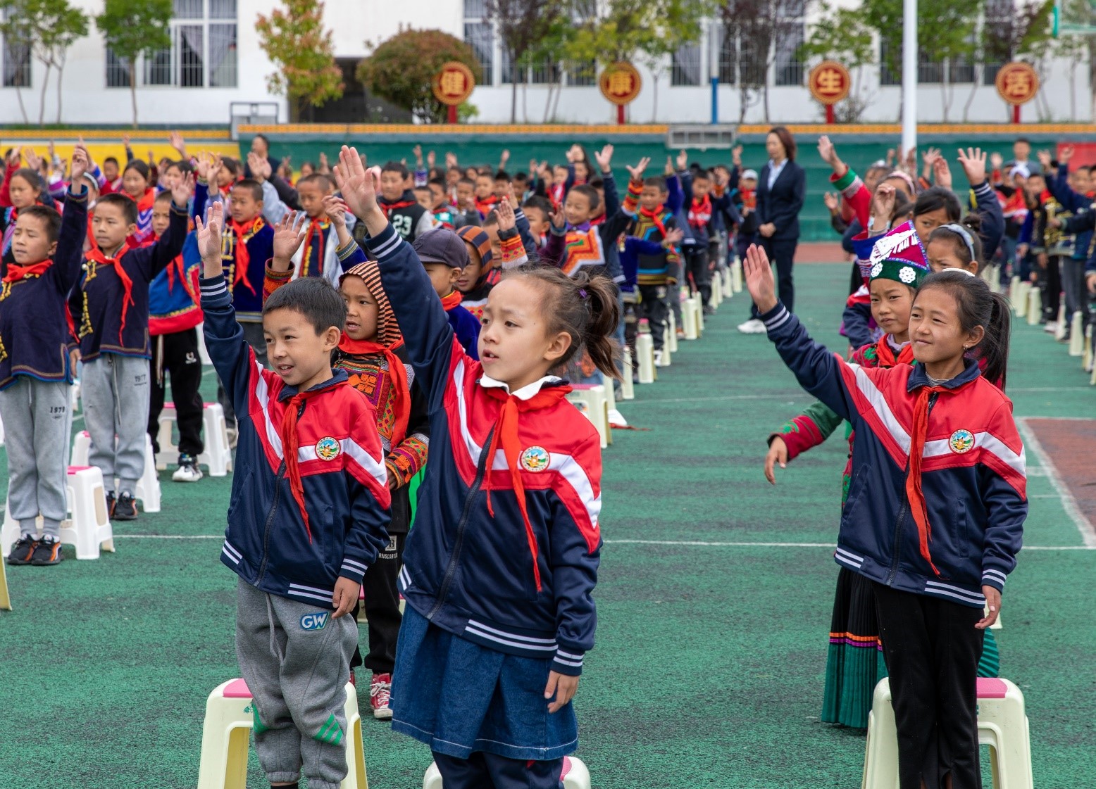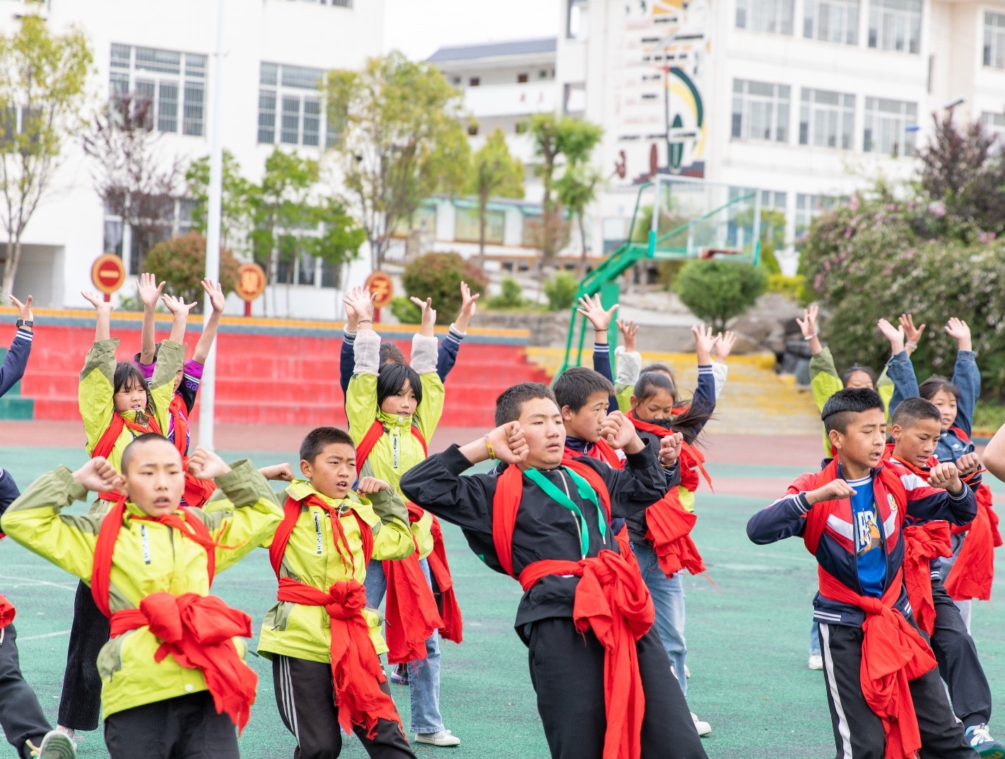 操場上,云寶舞蹈隊隊員們和指導(dǎo)教師邱英老師正在排練他們的王牌作品——《彝紅》,這是一支充滿彝族元素、表現(xiàn)彝族精神的舞蹈。 隨著老一批云寶舞蹈隊隊員的畢業(yè)升學(xué),練習(xí)《彝紅》的隊員們都換成了新面孔。盡管還不能說爐火純青,但每一位隊員都很努力,我們從隊員們的臉上,看到了極佳的表現(xiàn)力。
