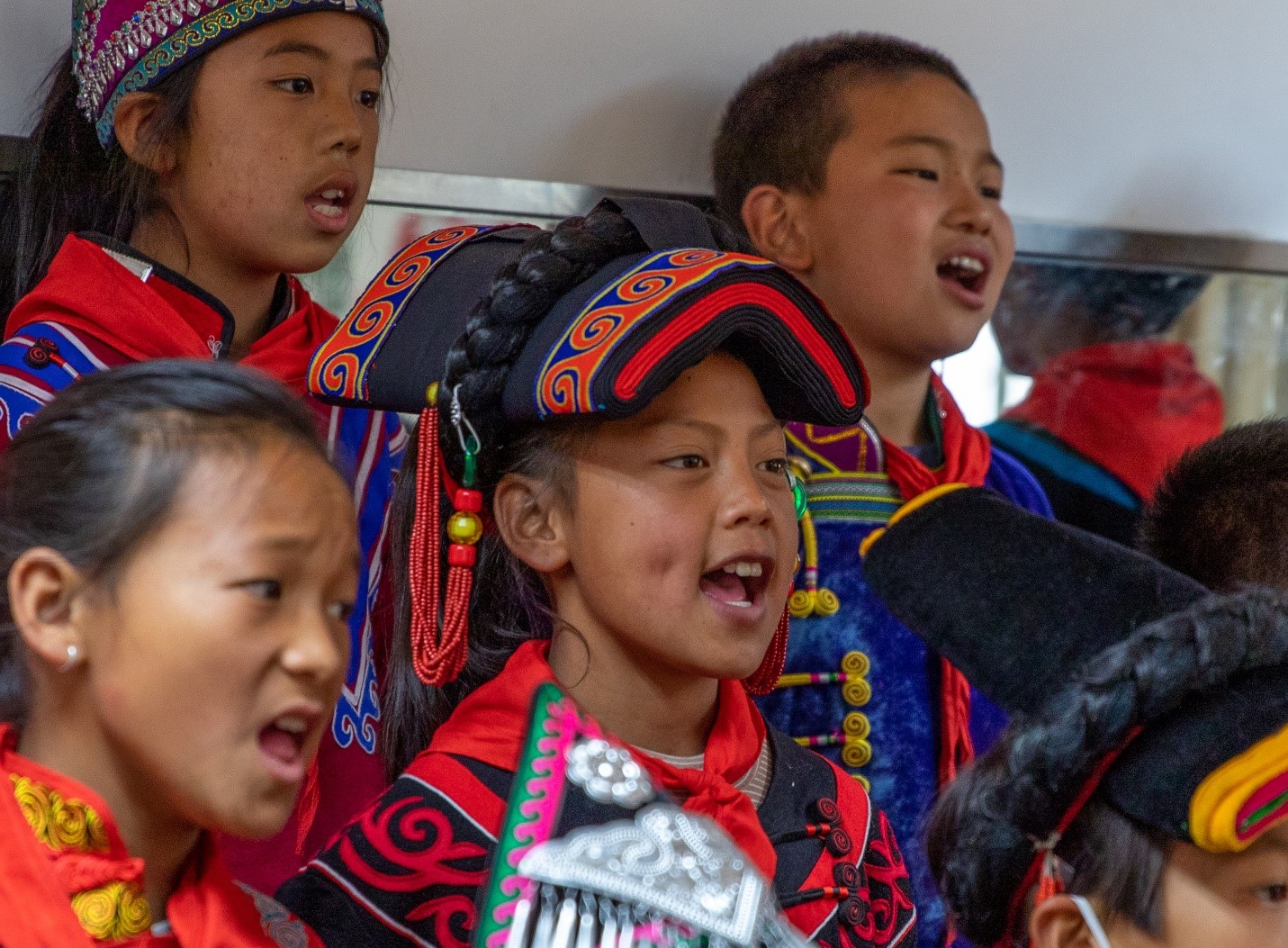 楊花校長是云寶舞蹈隊項目總負(fù)責(zé)人,云寶舞蹈隊可以說是在她的帶領(lǐng)下一路成長起來,她也有自己的藝術(shù)堅持:對于《彝紅》不斷進(jìn)行創(chuàng)新、優(yōu)化,精益求精??梢钥隙ǖ氖牵麄儗τ谝妥逦幕膫鞒泻蛨猿钟肋h(yuǎn)不會變。離開操場,耳聞清亮的歌聲,循聲前行,原來是象寶合唱團(tuán)正在訓(xùn)練中。活動教室里,隊員們跟著指導(dǎo)教師期沙高忠老師的指揮,用心練習(xí)彝族歌曲《索瑪花開》和《天空之城》,孩子們唱得既投入又享受。