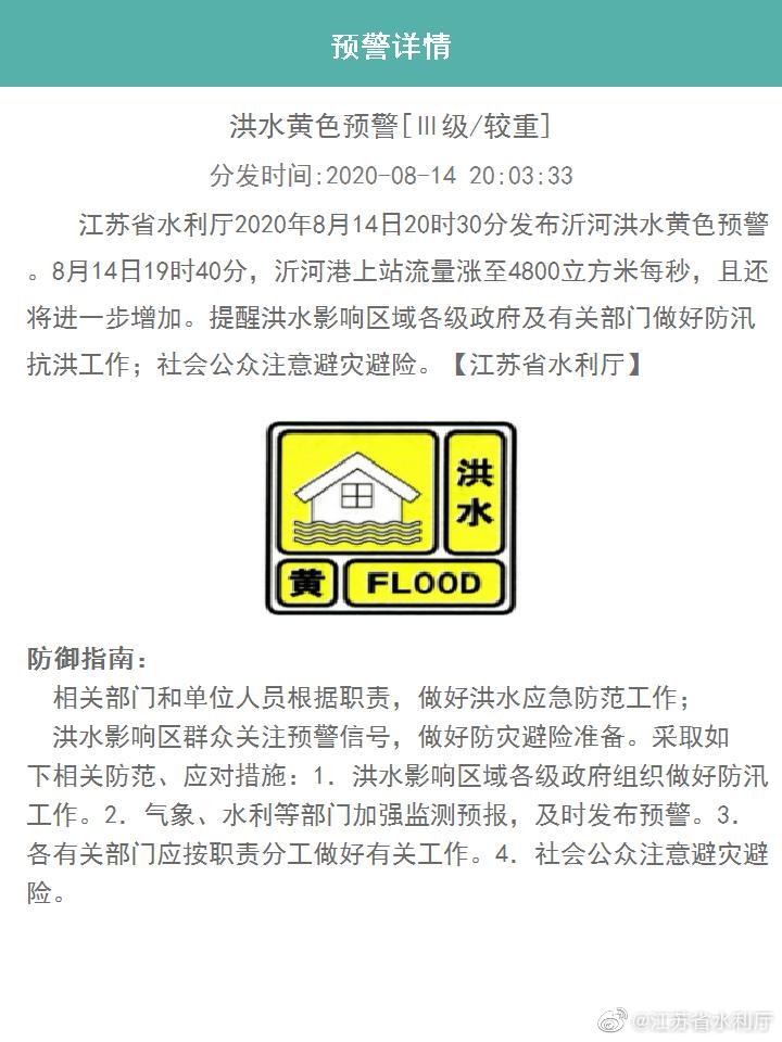 (記者 盧河燕)江蘇省水利廳2020年8月14日20時30分發(fā)布沂河洪水黃色預警。
