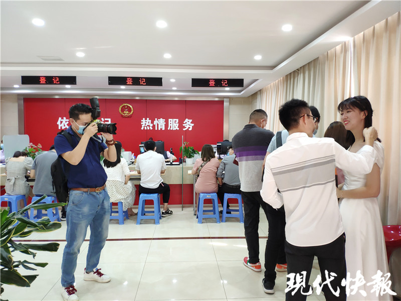 像是約好了一樣,當(dāng)天穿著禮服、戴著白紗的還有好幾個姑娘。28歲的小鄭就是其中之一。在等候領(lǐng)證時,身旁的男友小段不時幫她整理裙子。現(xiàn)代快報記者了解到,這對小情侶都畢業(yè)于東南大學(xué),研究生期間跑步鍛煉時相識,在一起五年了。當(dāng)天,和他們一起來婚姻登記處的還有一個專業(yè)攝影師。