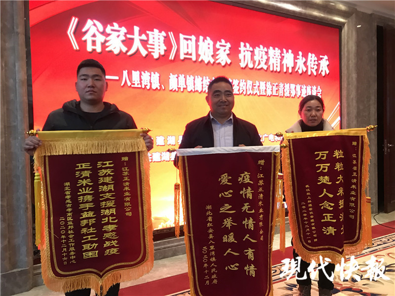 “老徐一家捐贈的大米,為我鎮(zhèn)打贏疫情阻擊戰(zhàn)提供了強(qiáng)力支持,體現(xiàn)了大家庭的溫暖。”在現(xiàn)場,湖北黃岡市紅安縣八里灣鎮(zhèn)鎮(zhèn)長李順祥介紹了當(dāng)?shù)厣舷乱恍墓餐挂叩氖论E,表達(dá)對徐正青一家的感激之情,同時與建湖縣顏單鎮(zhèn)締結(jié)為友好鎮(zhèn)。