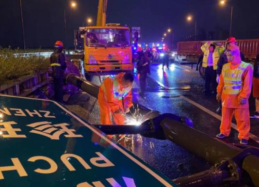 昨晚十點(diǎn),南京市公路中心江北公路站在處置倒伏的路燈桿件。 通訊員 孫逸飛 南京日?qǐng)?bào)/紫金山新聞?dòng)浾?董家訓(xùn) 徐琦 攝