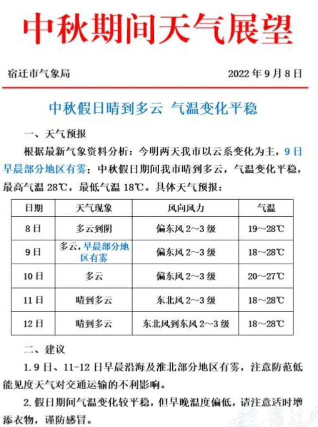 9月9日早晨宿遷部分地區(qū)有霧;中秋假期最高氣溫28℃,最低氣溫18℃。