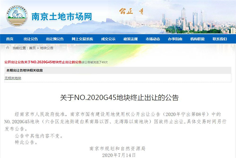 早在6月12日,南京掛出10幅涉宅地塊,要求按照“限房價、競地價”的方式出讓。7月14日,南京市規(guī)劃和自然資源局發(fā)布公告稱,經(jīng)南京市人民政府批準,南京市國有建設(shè)用地使用權(quán)公開出讓公告(2020年寧出第08號)中的NO.2020G45地塊(六合區(qū)龍池街道白果南路以西、龍灣路以南地塊)因故終止出讓,具體交易時間另行發(fā)布公告。