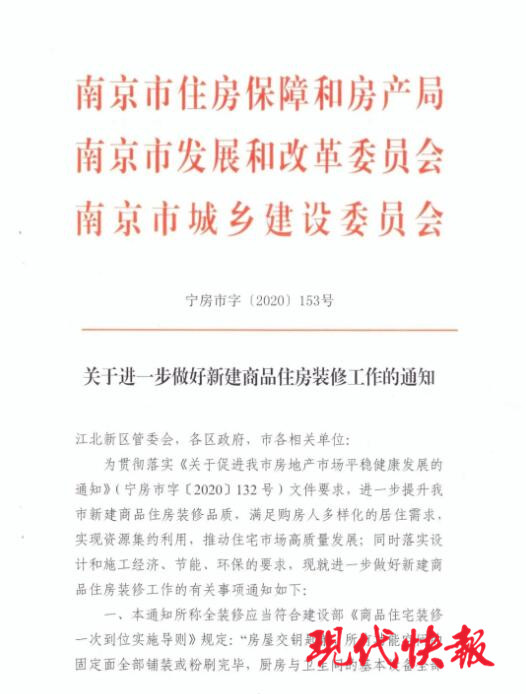 現(xiàn)代快報記者了解到,《通知》自2020年8月14日發(fā)布之日起實施。凡是南京市通過“限房價、競地價”模式出讓的地塊一律采用;其他項目,開發(fā)企業(yè)可根據(jù)具體項目的區(qū)域位置、品質(zhì)特點、產(chǎn)品定位等情況自行選擇是否適用。另外,2019年1月11日《關(guān)于進一步加強我市商品住房全裝修建設(shè)管理的通知》(寧房市字〔2019〕15號)與本《通知》要求不一致的,以本《通知》為準。