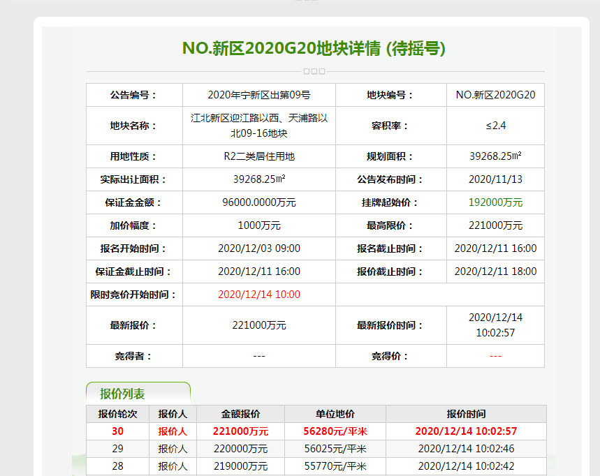 江北新區(qū)G20地塊,是一幅二類居住用地,東至迎江路、西至規(guī)劃道路、南至天浦路、北至江苑路。在當天土拍中,新區(qū)G20經(jīng)30輪競價后,觸頂最高限價22.1億元。根據(jù)土拍規(guī)則,該地塊將于12月15日15點進行現(xiàn)場搖號,未來毛坯房銷售限價31500元/㎡。另一幅宅地新區(qū)G21位于隧道口片區(qū),經(jīng)19輪競價以總價15.2億元成交,未來毛坯房銷售限價為30000元/㎡。