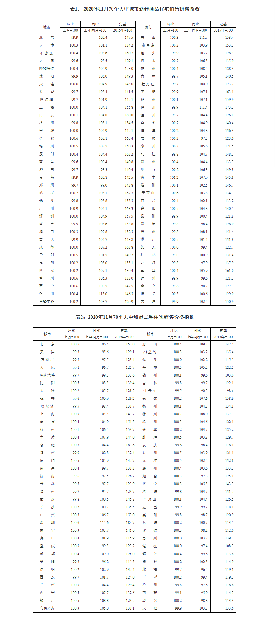 國家統(tǒng)計局城市司首席統(tǒng)計師繩國慶解讀稱,11月份商品住宅銷售價格漲幅穩(wěn)中有落。2020年11月份,各地認(rèn)真貫徹落實黨中央、國務(wù)院部署,緊緊圍繞穩(wěn)地價、穩(wěn)房價、穩(wěn)預(yù)期的調(diào)控目標(biāo),進一步落實房地產(chǎn)長效機制,推動房地產(chǎn)市場平穩(wěn)健康發(fā)展,70個大中城市房地產(chǎn)市場價格漲幅總體平穩(wěn),略有回落。