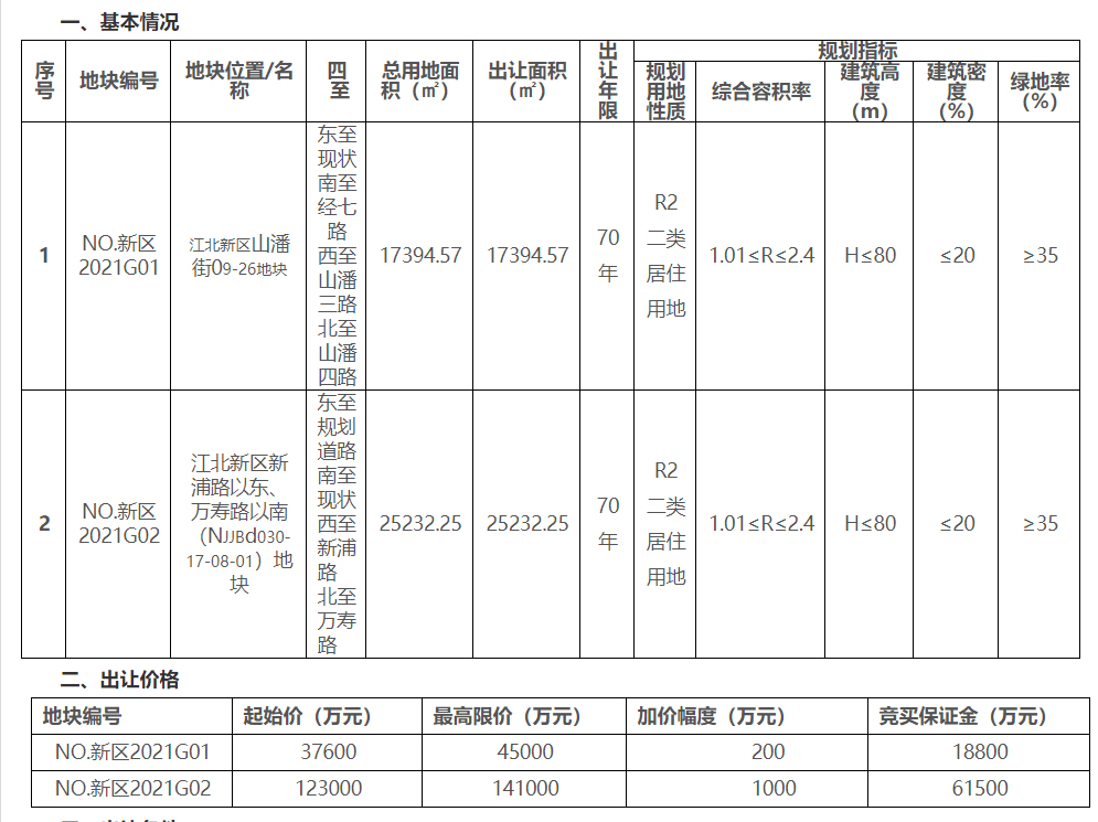 (記者 潘榮 張瑜)1月7日,南京土地市場網(wǎng)發(fā)布2021年寧新區(qū)出第1號(hào)土地出讓公告,掛出江北新區(qū)的2幅純宅地,其中新區(qū)G01地塊位于六合大廠、新區(qū)G02地塊位于江北核心區(qū)。總用地面積4.26公頃,起拍總價(jià)16.06億元。該2幅地塊將于2月5日上午10點(diǎn)開始網(wǎng)上競拍。