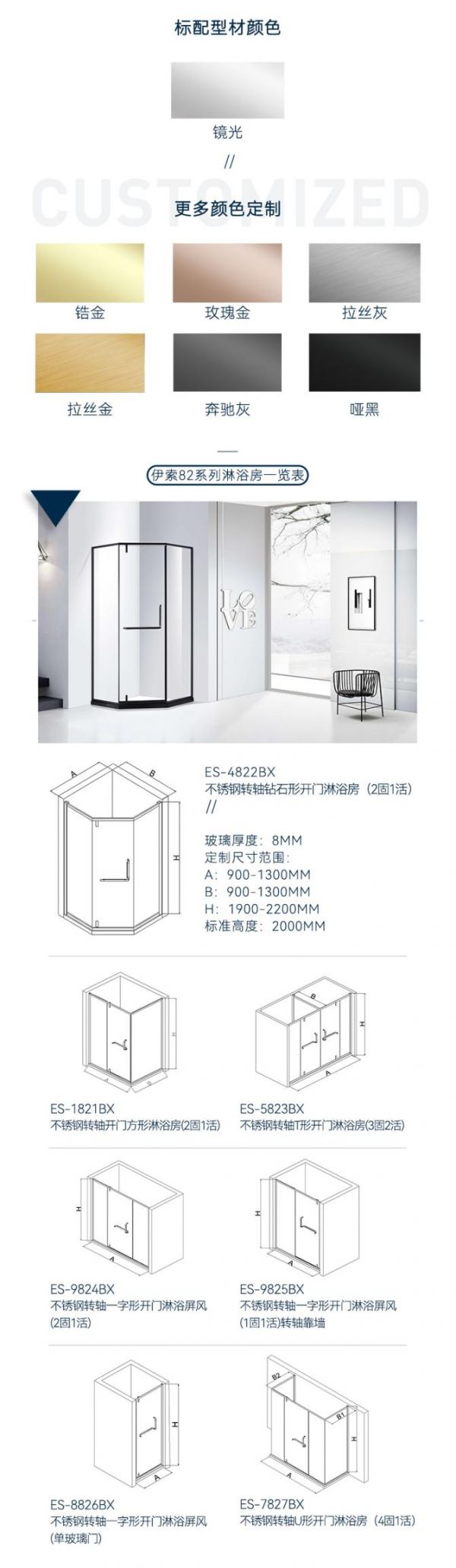 淋浴房形狀、尺寸、型材顏色、玻璃圖案、開門方式皆可自由定制。