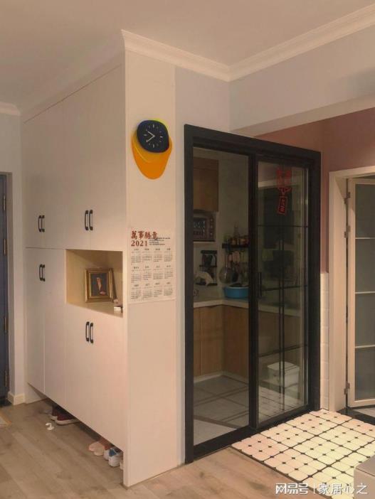 把廚房空間縮小了一下,設(shè)計(jì)成一面墻的玄關(guān)柜,美觀實(shí)用,進(jìn)門收納方便輕松,柜子是很簡(jiǎn)單的黑白配風(fēng)格,多隔斷滿足各種收納需求,最下面鏤空區(qū)域放置鞋子,柜子側(cè)面雖然不大,但選擇了一個(gè)大小剛剛好的時(shí)鐘,既美觀實(shí)用又能點(diǎn)綴生活。