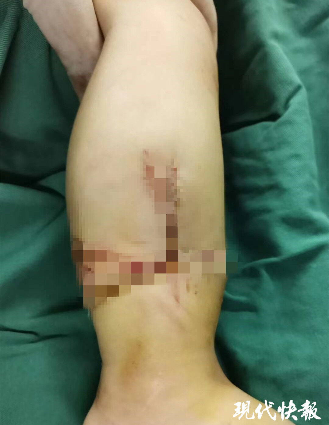 “家長鞋都沒有穿就抱著孩子來了,情況非常緊急。孩子右小腿裹著紗布,做過簡單包扎。打開一看傷口觸目驚心,是一個大的L形的傷口,皮下一直拉到肌腱層,向后方撕開,脂肪和肌腱外露。”看到如此嚴重的傷口,接診的淮安市婦幼保健院小兒外科主治醫(yī)師王挺表示嚇了一跳。“原來,家人在農(nóng)忙的時候,電動三輪車停放在田邊,三輪車當(dāng)時還處于一個可以行駛的狀態(tài),孩子爬了上去啟動了三輪車,造成三輪車急加速發(fā)生旋轉(zhuǎn)然后翻車,孩子右小腿被銳器直接撕開。”王挺說。