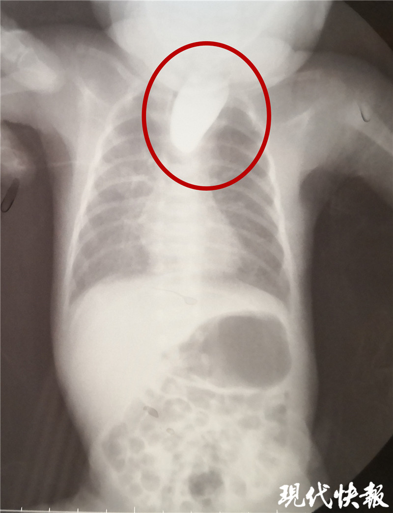 現(xiàn)代快報(bào)記者了解到,9月8日,東東從當(dāng)?shù)蒯t(yī)院轉(zhuǎn)入淮安市婦幼保健院治療,檢查顯示東東的食道是個(gè)“死胡同”,明確診斷為食道閉鎖。“從片子上看,這個(gè)白色的造影劑到了食管上端就無法向下流了,說明孩子的食管上端是不通的、閉塞的。同時(shí),孩子腸腔里面有氣體,這個(gè)氣體是通過氣道到食管的遠(yuǎn)端,到達(dá)胃和腸道內(nèi)。”淮安市婦幼保健院小兒外科副主任醫(yī)師夏順林說,這個(gè)寶寶如果不及時(shí)手術(shù),就會(huì)面臨兩個(gè)問題,一個(gè)就是唾液咽不下去,會(huì)嗆入肺部形成吸入性肺炎,同時(shí)胃和食管遠(yuǎn)端與氣管相通,胃內(nèi)的胃酸容易反流到氣道里面,進(jìn)入肺部形成化學(xué)性肺炎。