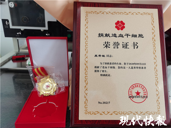 △ 捐獻(xiàn)造血干細(xì)胞榮譽(yù)證書和獎(jiǎng)?wù)?/p>