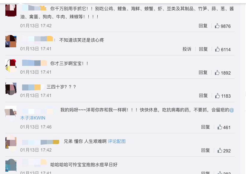 在評論區(qū),粉絲們也是操碎了心。有的提醒木子洋要忌口,有的表達了早日康復的祝愿,也有的說感同身受,因為自己也起了水痘,當然也有粉絲不厚道,重點竟然放在了“三四十歲”的年紀上……
