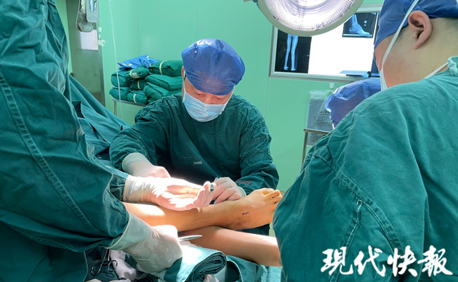 △手術(shù)前,醫(yī)院副院長石榮劍查看其腳部情況