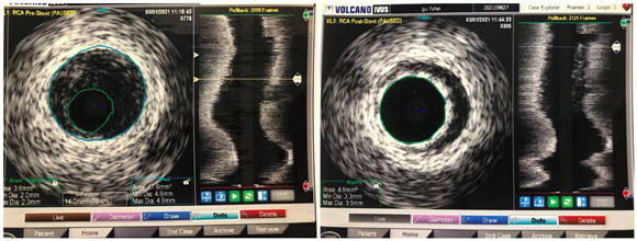 今年70歲的李大爺(化名)因“反復胸悶不適半年”入院,半年前曾行冠狀動脈造影,未達到處理指征,術(shù)后規(guī)范用藥治療。但患者平日仍感覺胸悶不適,入院后醫(yī)生精準評估血管病變情況,建議行血管內(nèi)超聲檢查指導下一步手術(shù)方案。經(jīng)過反復對比分析,IVUS測得患者右冠遠端高度狹窄,最狹窄處約80%,達到了干預標準。征得患者及家屬同意后,對右冠病變處成功置入支架一枚,患者反復胸悶癥狀也得以解決。
