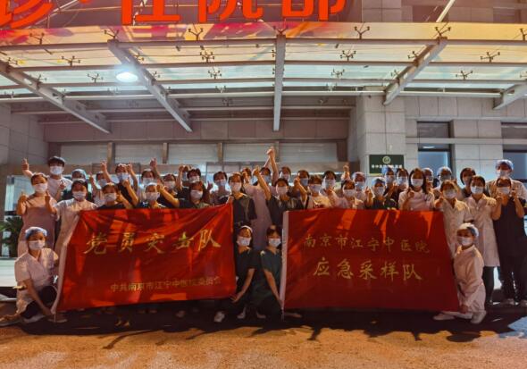 7月23日凌晨5點(diǎn),整個(gè)城市還在睡夢(mèng)中的時(shí)候,江寧中醫(yī)院住院部樓前240名醫(yī)護(hù)人員已經(jīng)集合完畢,將要奔赴屬于他們的“主陣地”——江寧祿口街道,第二輪核酸采集工作即將開始。在住院部燈光的映襯下鮮紅的旗幟顯得格外耀眼。