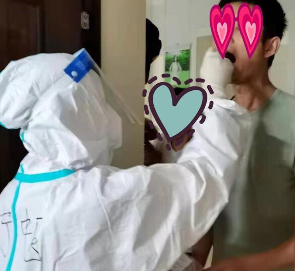 下午的任務(wù)更加艱巨,需要上門進(jìn)行核酸采集,大家快速解決午飯、補(bǔ)充水分后就開始行動(dòng)了。根據(jù)分配的名單信息,王維在志愿者的幫助下挨家挨戶地上門確認(rèn),她所負(fù)責(zé)的區(qū)域是一棟六層樓的老小區(qū),共四個(gè)單元,沒有電梯,需要一層一層地爬上去,再爬下來,再上去,如此周而復(fù)始。六層樓不斷來回爬本就是極其消耗體力的,再加上當(dāng)天悶熱的天氣、密不透風(fēng)的防護(hù)服讓她的體力基本處于透支狀態(tài),濕透的褲子裹住雙腿,邁開的步伐越來越沉重,終于爬上六樓時(shí),她感覺腦袋都要炸開了,開始耳鳴聽不清別人說的話,她靠在欄桿上,感覺自己的雙腿不停地發(fā)抖,她艱難地告訴志愿者讓家里的老奶奶稍等一下,她要歇一歇。此時(shí)屋內(nèi)等候采集的老奶奶也察覺出王維的不適了,要讓她進(jìn)屋休息一下,可此時(shí)身穿防護(hù)服的王維知道這是絕對(duì)不行的,在疫情面前不能絲毫懈怠,她搖了搖頭,老人家就貼心地將家里的電風(fēng)扇轉(zhuǎn)了個(gè)方向,對(duì)著王維吹,看著老奶奶忙前忙后,雖然電風(fēng)扇的風(fēng)吹不進(jìn)她的防護(hù)服,卻吹進(jìn)了她的心里,讓疲憊不堪的王維突然感到了一絲涼意。休息過后王維的體力稍有了恢復(fù),頭疼也有了緩解,于是她完成了老奶奶的核酸采集。