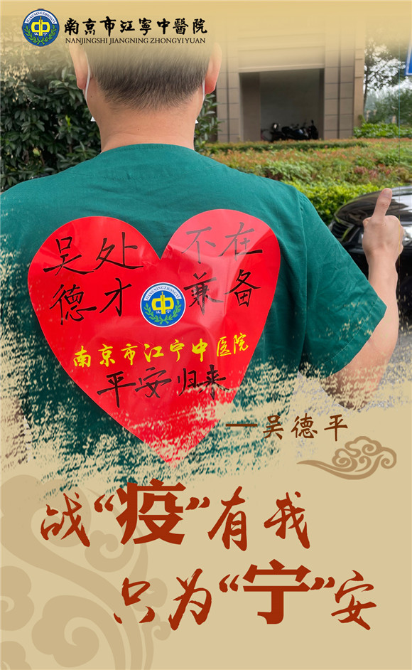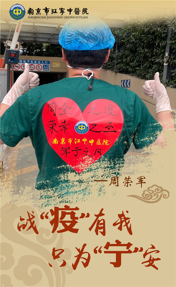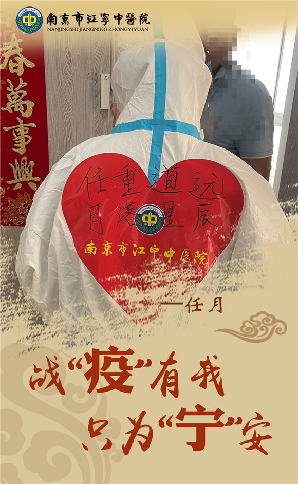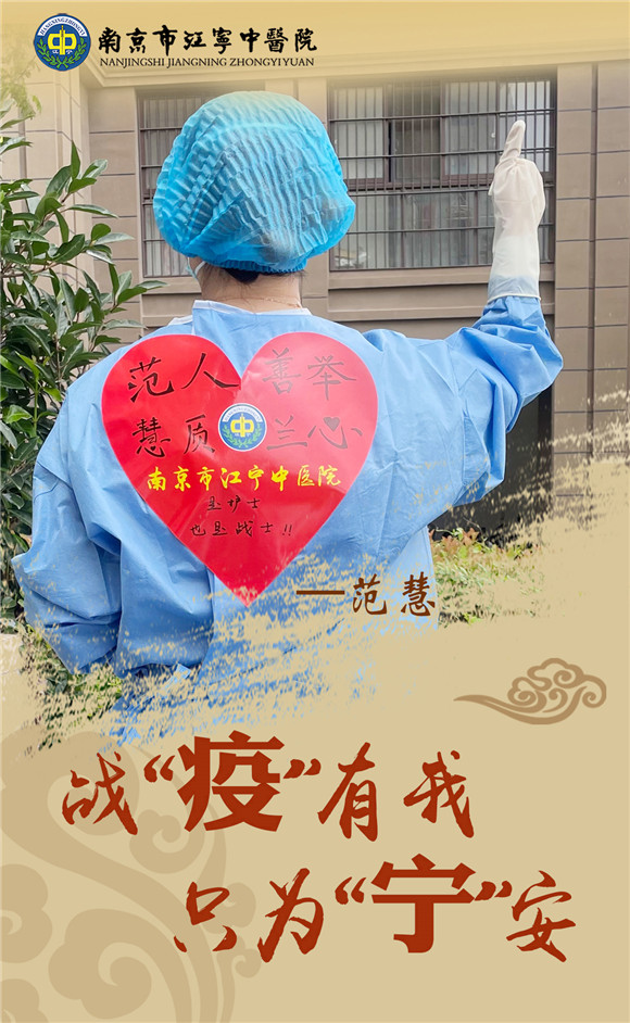 看不見防護(hù)服里流滿汗水的你;看不清面屏下憔悴面容的你;看不透明明很辛苦卻要堅(jiān)持到底的你,唯一能看清的是防護(hù)服上藏有你名字的戰(zhàn)“疫”標(biāo)語和有著醫(yī)院名稱的紅色愛心。初心使然,唯有前行;使命在肩,唯有奮進(jìn)!你們團(tuán)結(jié)一心,匯聚起戰(zhàn)勝病毒的磅礴力量,你們有著一個(gè)共同的名字“江寧中醫(yī)人”!