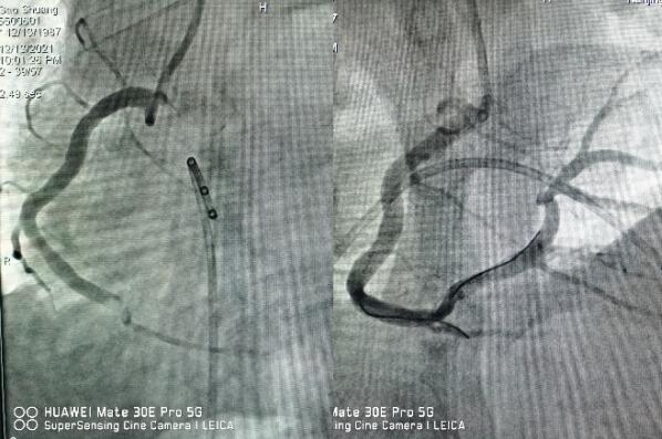 醫(yī)生立即予以搶救,并第一時間通知心內(nèi)科值班醫(yī)師,緊急啟動綠色通道,全院相關(guān)科室全力配合,心內(nèi)科介入團隊分工明確,迅速啟動導(dǎo)管室。因患者心梗后并發(fā)嚴(yán)重心律失常,為了安全起見,造影前植入臨時起搏器,造影提示右冠狀動脈急性完全閉塞,并成功開通血管,患者胸痛即刻緩解,目前正在康復(fù)過程中。