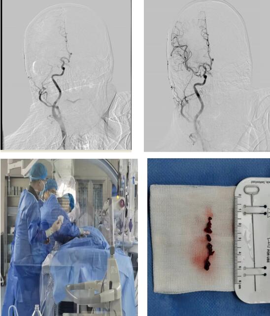 雖然病情危急、手術(shù)風險大,但在醫(yī)務人員默契配合、全力以赴下,1小時后成功取出質(zhì)地柔軟的血栓,頓時血流暢通達到TICI3級,血管造影復查血流恢復通暢,手術(shù)成功,患者轉(zhuǎn)危為安。