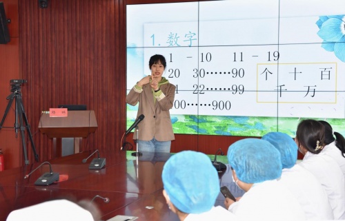 此次培訓(xùn)講座線上線下同步進(jìn)行,由中醫(yī)院莊群副院長主持,特邀江寧特殊教育學(xué)校楊琳老師進(jìn)行授課,醫(yī)院窗口工作人員及醫(yī)護人員共80余人參與學(xué)習(xí)。楊琳老師一直致力于殘障兒童教育工作,在手語教育中積累了豐富的經(jīng)驗。培訓(xùn)中,楊老師先從基礎(chǔ)的數(shù)字拼音入手,再聯(lián)系醫(yī)院實際情況就醫(yī)用術(shù)語、檢查治療、就診流程等日常用語進(jìn)行講解與演示,學(xué)員們一邊認(rèn)真聽講一邊仔細(xì)揣摩手語動作意義,模仿手語動作表情。楊老師生動風(fēng)趣的教學(xué),極大地調(diào)動了窗口工作人員的學(xué)習(xí)熱情,也讓她們深深感受到手語帶來的非凡魅力,課堂氣氛輕松愉悅。