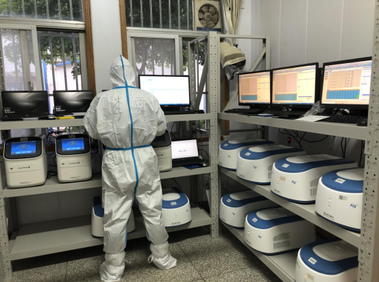 對大多數(shù)普通群眾而言,核酸檢測只需幾秒鐘就可完成,但對檢驗人員來說,這項工作才剛剛開始。每一份標本送到核酸檢測實驗室,都需要經(jīng)過實驗室一區(qū)的標本接收、數(shù)量統(tǒng)計、信息核對、分檢、編號、標本處理,調(diào)配試劑到實驗室二區(qū)的核酸提取,再到三區(qū)的擴增、結(jié)果分析、上傳數(shù)據(jù)……一系列復雜耗時的過程,加上長時間戴著雙層乳膠手套、成千上萬次的擰蓋加樣,這些都讓磨破手皮、手腳抽筋的情況變成實驗室每一位醫(yī)護人員的工作常態(tài)。隨時接收來自封控區(qū)和高速卡點等高風險區(qū)的標本,工作在離病毒最近的地方,面臨著巨大的風險,包括李霆在內(nèi)的檢驗人員從來沒有退縮,而是努力克服心理和生理壓力,奮戰(zhàn)在這個幕后的偉大崗位上。他們每日穿著防護服不吃不喝連續(xù)工作6-8小時,24小時輪班,夜以繼日的不懈堅守,超負荷完成了高于平常幾倍的檢測工作量。正因為他們的堅守,才使得一輪又一輪的全員核酸檢測工作有條不紊的進行。