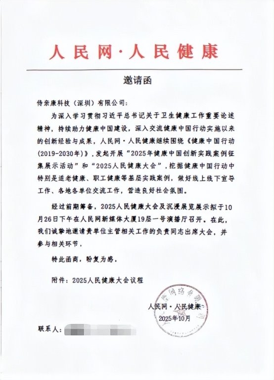 近日,侍親康科技(深圳)有限公司收到來自人民網(wǎng) · 人民健康 的正式邀請函,受邀出席于2025年10月26日在北京舉行的"2025 人民健康大會 " 。此次大會是健康中國建設(shè)領(lǐng)域的重要盛會,侍親康科技的入圍標(biāo)志著企業(yè)在健康老齡化領(lǐng)域 的創(chuàng)新實踐獲得了國家級媒體與行業(yè)專家 的高度認(rèn)可。