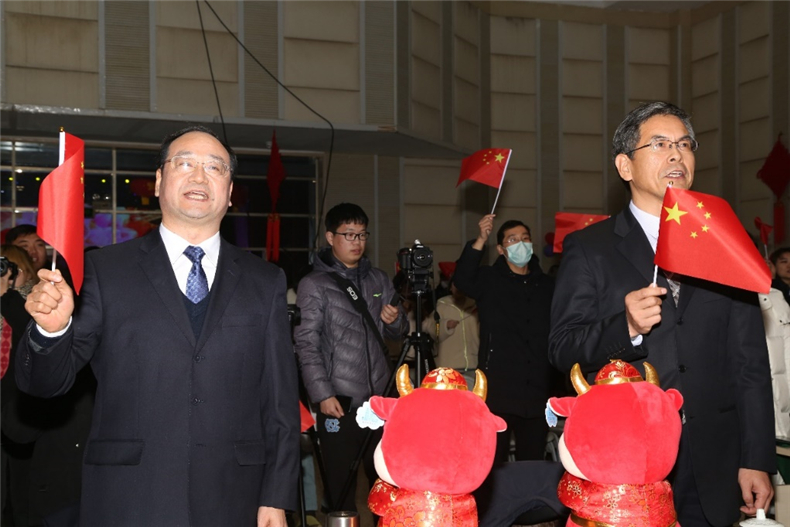 宿遷學(xué)院黨委書記徐德(左一)、校長劉志遠(右一)等領(lǐng)導(dǎo),在舞臺下與臺上演出師生一起激情演唱《歌唱祖國》 (中國攝影家協(xié)會會員 劉 峰 攝影報道)