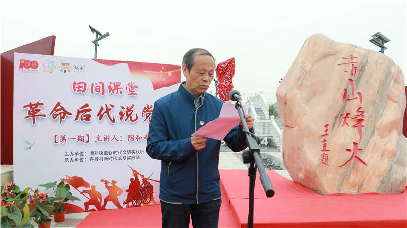為慶祝中國(guó)共產(chǎn)黨成立100周年,4月7日,南京市江寧區(qū)湖熟街道新時(shí)代文明實(shí)踐所聯(lián)合丹桂村新時(shí)代文明實(shí)踐站在赤山烽火廣場(chǎng)開(kāi)展了田間課堂之“革命后代說(shuō)黨史”活動(dòng),特別邀請(qǐng)到革命先烈陶家齊之子陶和壽先生來(lái)到現(xiàn)場(chǎng),以面對(duì)面、心連心的方式讓湖熟青年繼承革命傳統(tǒng)、傳承紅色基因、傳遞革命薪火,進(jìn)一步加強(qiáng)對(duì)黨史的認(rèn)識(shí),厚植愛(ài)國(guó)愛(ài)黨情懷。