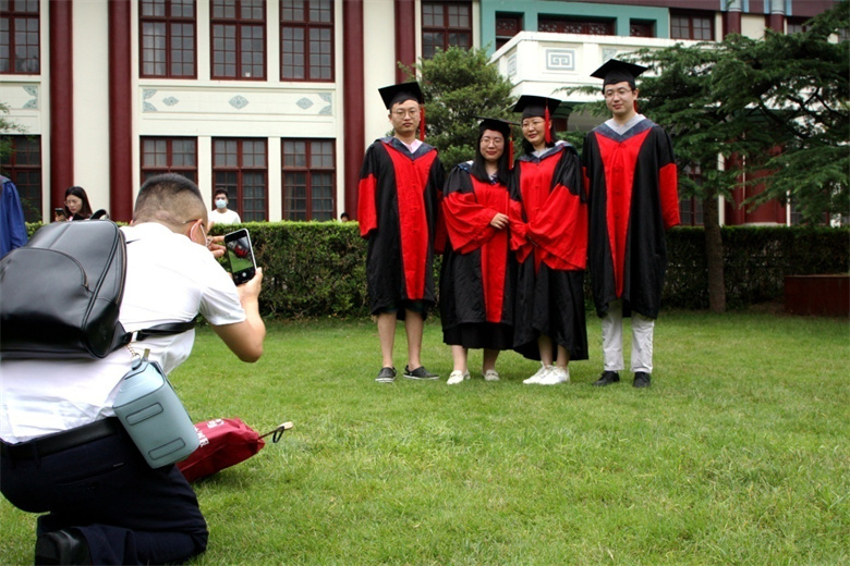 校園教學(xué)樓前獲得博士學(xué)位的畢業(yè)生合影留念