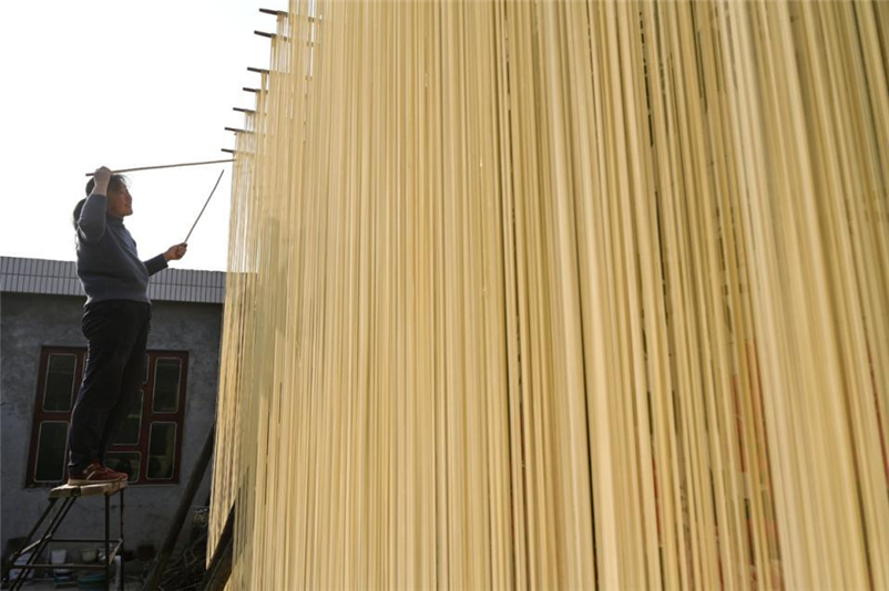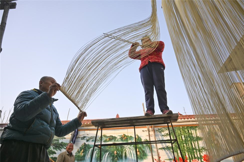 常旗營(yíng)是山西永濟(jì)開(kāi)張鎮(zhèn)的一個(gè)村莊,由古代的一個(gè)兵營(yíng)發(fā)展而來(lái),因村民都掌握一門(mén)做掛面的手藝而被稱(chēng)為“手工掛面村”,據(jù)說(shuō)村里做手工掛面的歷史已經(jīng)有百余年,幾乎家家戶(hù)戶(hù)都能做出條細(xì)如絲、筋道耐煮、易于消化的手工掛面。七、八年前,作為攝影愛(ài)好者,我們?cè)?jīng)來(lái)到村里拍攝制作掛面的場(chǎng)景,當(dāng)時(shí)接待我們的就是陳世民夫婦,所以我們之間也算是老熟人了。