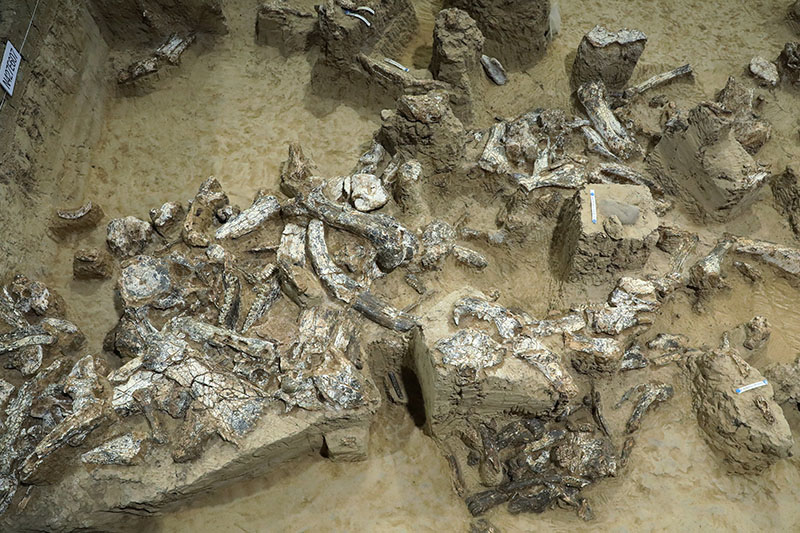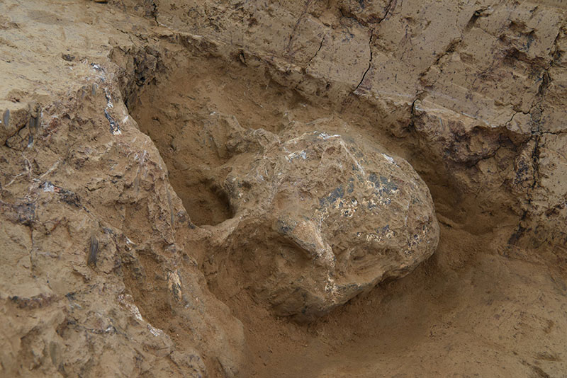 湖北十堰學堂梁子遺址發(fā)掘現(xiàn)場被命名為“鄖縣人3號頭骨”古人類頭骨化石出土情況(國家文物局供圖)。