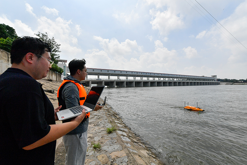 8月2日,在天津市獨流減河進洪閘上游,水文人員操作無人水文監(jiān)測船進行水文監(jiān)測。新華社記者 孫凡越 攝