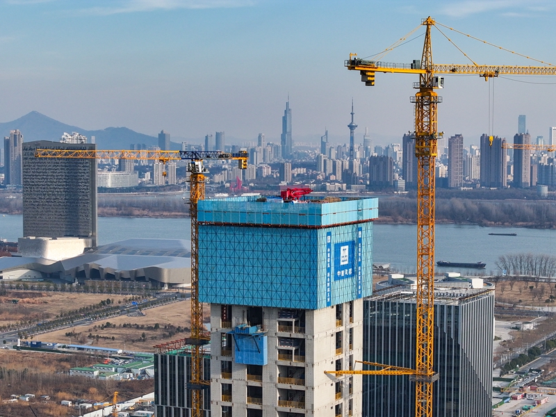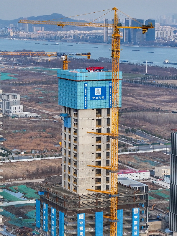 當日,在江蘇省南京市江北新金融中心一期項目施工現(xiàn)場,承建方中建三局運用“空中造樓機”進行項目封頂前的最后一次頂升作業(yè),各項施工穩(wěn)步推進。據(jù)介紹,該項目建造采用智能集成“空中造樓機”,提高了高層建筑施工的機械化、智能化及綠色施工水平,讓“高空作業(yè)”變?yōu)椤笆覂?nèi)施工”,施工效能提升約20%。
