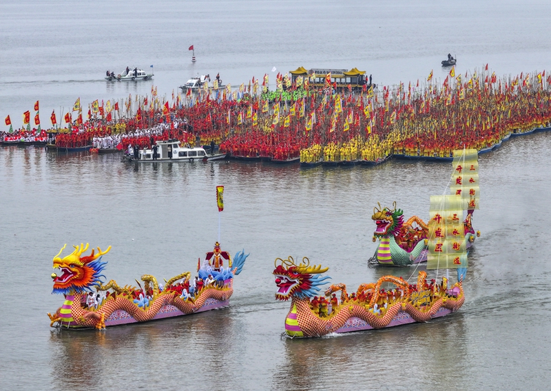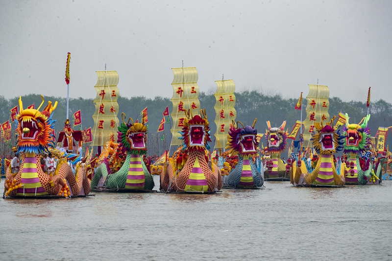 4月6日,人們參加會(huì)船舞龍表演。新華社發(fā)(湯德宏?攝)
