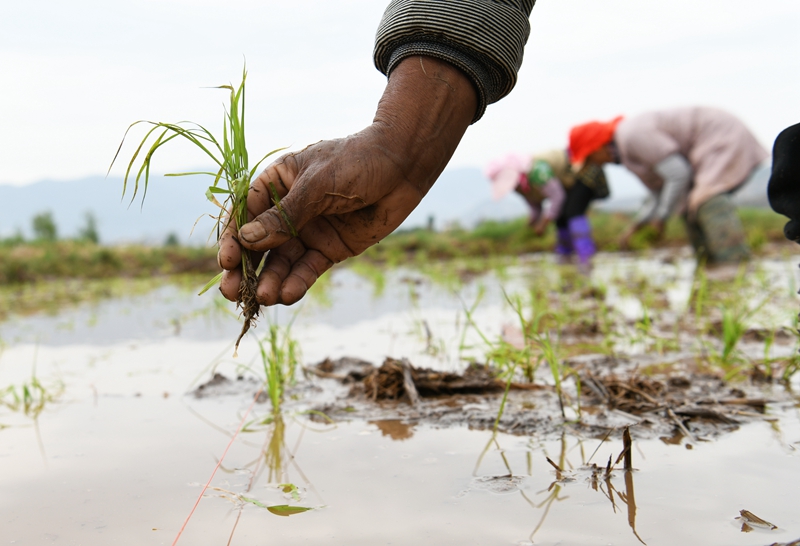 5月5日,農民在云南省麗江市古城區(qū)金山街道東元社區(qū)的農田里移栽水稻秧苗。 新華社發(fā)(趙慶祖?攝)