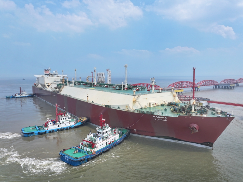 7月5日,來自卡塔爾的LNG船舶“阿米拉”靠泊江蘇如東洋口港LNG碼頭(無人機(jī)照片)。新華社發(fā)(許叢軍?攝)