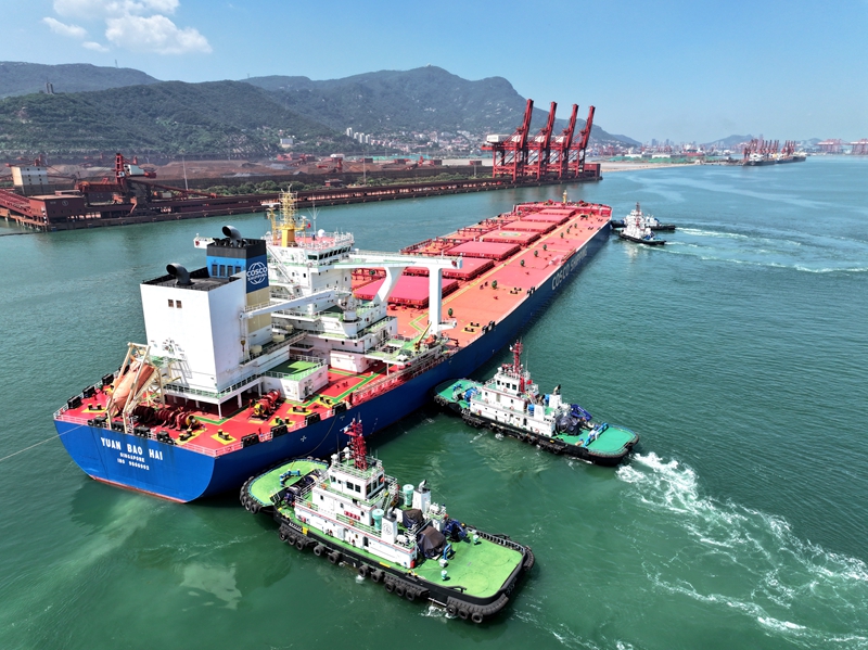 8月12日,從巴西駛來的滿載40萬噸鐵礦石的新加坡籍“遠寶?!陛喛坎唇K省連云港新蘇港碼頭。該輪長362米、寬65米,是今年以來靠泊連云港的第15艘40萬噸級貨輪。新華社發(fā)(王春?攝)