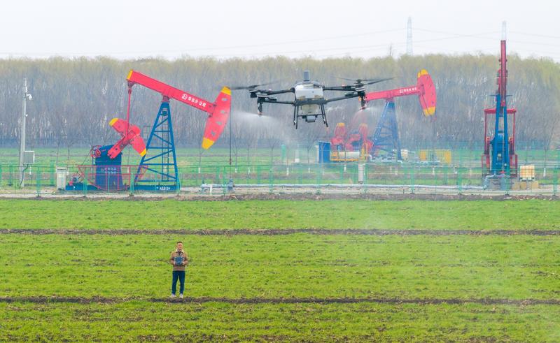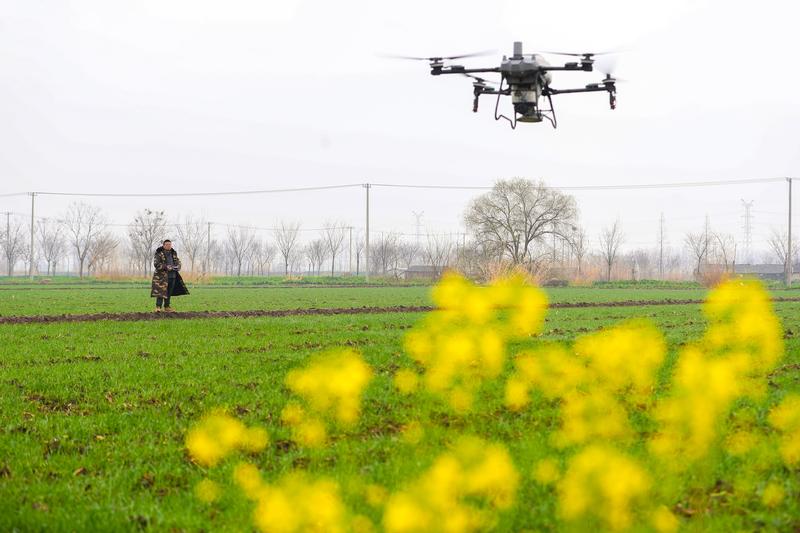3月5日,在江蘇省興化市陳堡鎮(zhèn)蔡堡村,種植戶使用植保無(wú)人機(jī)為小麥?zhǔn)┓省? 當(dāng)日是驚蟄,各地農(nóng)民搶抓農(nóng)時(shí),田間地頭一派忙碌景象。 新華社發(fā)(周社根 攝)