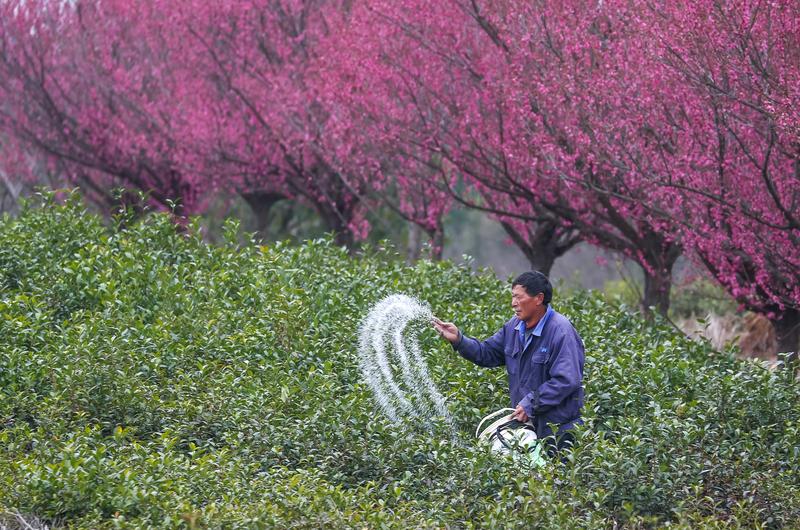 3月5日,茶農(nóng)在江蘇省句容市后白鎮(zhèn)西馮村一處茶園里施肥。 當(dāng)日是驚蟄,各地農(nóng)民搶抓農(nóng)時(shí),田間地頭一派忙碌景象。 新華社發(fā)(鐘學(xué)滿 攝)