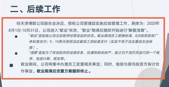 據(jù)媒體報(bào)道,近日曝光的一份內(nèi)部文件顯示,由于控股股東融資失敗,公司已無(wú)恢復(fù)正常經(jīng)營(yíng)的可能性,天津博郡股東會(huì)決定授權(quán)公司管理層處理后續(xù)管理工作,在2020年8月1日—10月31日期間,公司將會(huì)進(jìn)入“歇業(yè)”狀態(tài),“歇業(yè)”期滿后將進(jìn)入“解散清算”狀態(tài)。