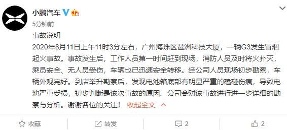 今天下午,小鵬汽車官微發(fā)布聲明對(duì)此事進(jìn)行了回應(yīng)。官方表示,2020年8月11日上午11時(shí)3分左右,廣州海珠區(qū)琶洲科技大廈,一輛G3發(fā)生冒煙起火事故。