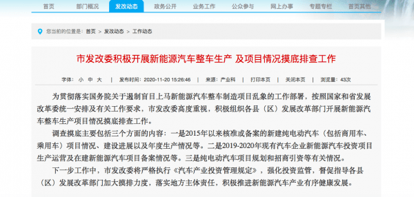 安順發(fā)改委官網(wǎng)在11月20日發(fā)布了標(biāo)題為“市發(fā)改委積極開展新能源汽車整車生產(chǎn)及項目情況摸底排查工作”的工作動態(tài),稱“為貫徹落實國務(wù)院關(guān)于遏制盲目上馬新能源汽車整車制造項目亂象的工作部署,按照國家和省發(fā)展改革委統(tǒng)一安排及有關(guān)工作要求,市發(fā)改委高度重視,積極組織各縣(區(qū))發(fā)展改革部門開展新能源汽車整車生產(chǎn)項目情況摸底排查工作。”