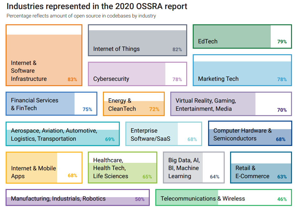 全球各行業(yè)代碼中使用開源項(xiàng)目的比例顯示