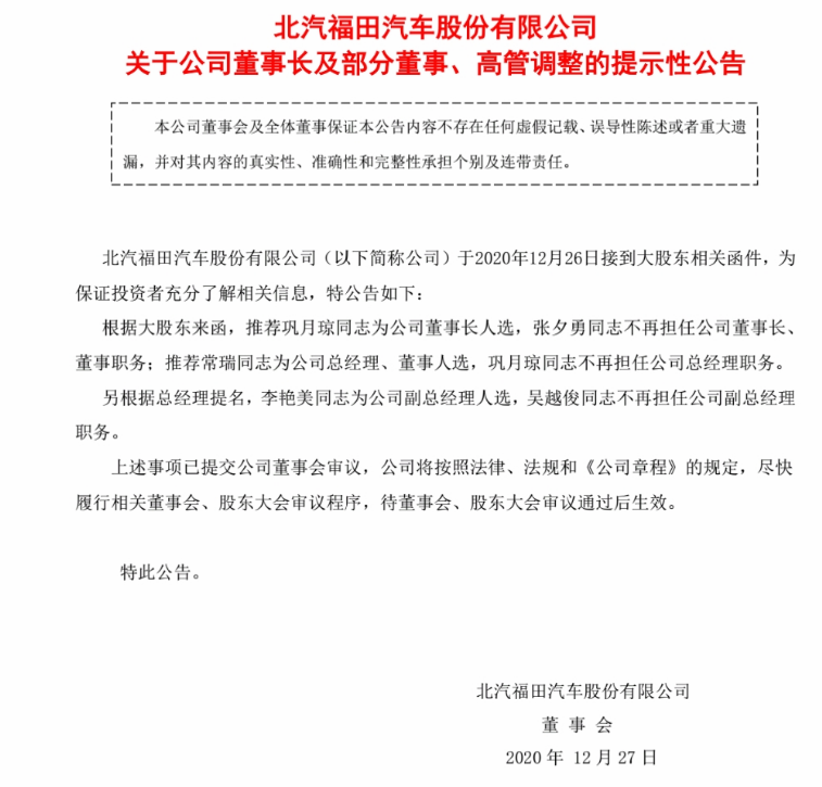 12月27日,北汽福田汽車股份有限公司(以下簡(jiǎn)稱“北汽福田”)發(fā)布公告稱,公司接到大股東相關(guān)函件,根據(jù)大股東來(lái)函,推薦鞏月瓊為公司董事長(zhǎng)人選,張夕勇不再擔(dān)任公司董事長(zhǎng)、董事職務(wù);推薦常瑞為公司總經(jīng)理、董事人選,鞏月瓊不再擔(dān)任公司總經(jīng)理職務(wù)。