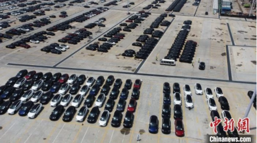 4月21日,剛下生產(chǎn)線的國(guó)產(chǎn)特斯拉正一輛輛有序停在工廠內(nèi)。 殷立勤 攝