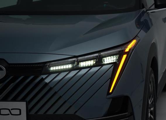 前臉進氣格柵運用精益化的V字型陣列設計,每一側(cè)有12條共24條進氣簾,鑲嵌精致的鎢鋼色飾條,縫隙寬度按等差數(shù)列漸開分布,打造出十足的機甲風格。一體式大燈集成了日行燈、位置燈、遠光燈、近光燈和轉(zhuǎn)向燈等模塊,造型仿佛兩顆獠牙一般,具有很強的獨特性和識別性。