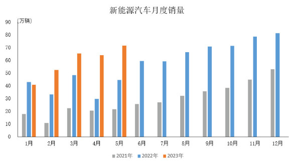 2023年5月,新能源汽車產(chǎn)銷分別完成71.3萬(wàn)輛和71.7萬(wàn)輛,環(huán)比分別增長(zhǎng)11.4%和12.6%,同比分別增長(zhǎng)53%和60.2%,市場(chǎng)占有率達(dá)到30.1%。