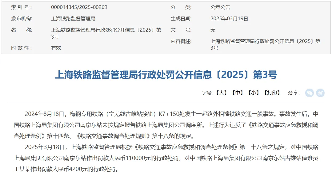 因未按規(guī)定報告相撞事故 南京東站被罰11萬元